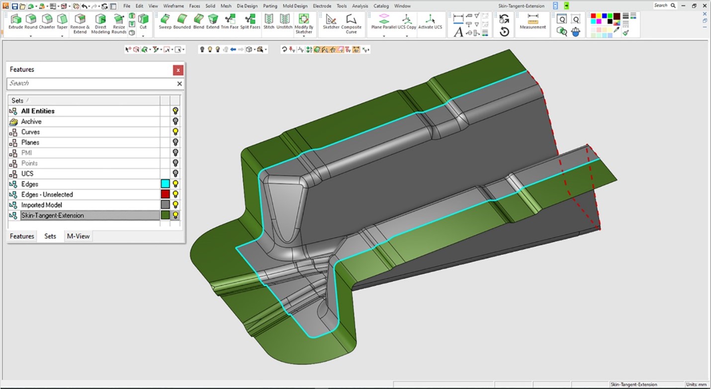 - Το Skin Tangent Extension είναι μια νέα λειτουργία μοντελοποίησης που επεκτείνει τις πλευρές εφαπτομενικά προς την ίδια κατεύθυνση των αρχικών επιφανειών. Η νέα λειτουργία είναι ιδιαίτερα χρήσιμη για την επέκταση γενικών όψεων (δηλαδή, όχι επίπεδων ή κωνικών όψεων). Ο χρήστης μπορεί να αποεπιλέξει τις άκρες για να μην τις επεκτείνει.