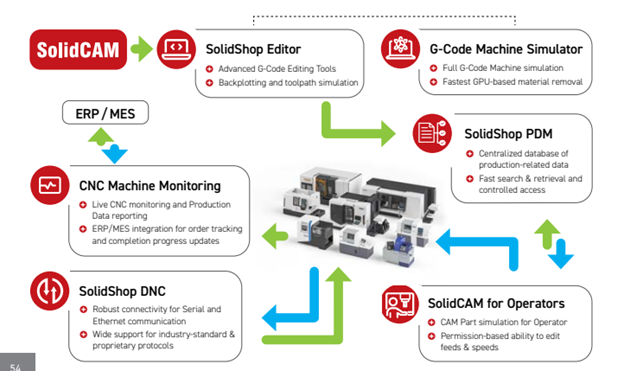 Το SolidShop είναι το ολοκληρωμένο οικοσύστημα της SolidCAM για τη διαχείριση, τον έλεγχο και την παρακολούθηση της παραγωγής CNC.Συνδέει τον προγραμματισμό CAM με τη γραμμή παραγωγής και δίνει στους κατασκευαστές τη δυνατότητα να μεγιστοποιήσουν την παραγωγικότητα, να ελαχιστοποιήσουν τα σφάλματα, να μειώσουν τους χρόνους αδράνειας, να καταργήσουν το χαρτί και να επιτύχουν πλήρη ιχνηλασιμότητα σε κάθε στάδιο της παραγωγής τους.